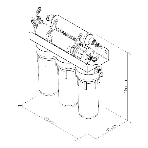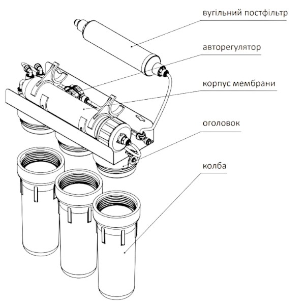 Основную очистку воды выполняет полупроницаемая мембрана с размером пор 0,0001 мкм, благодаря такому размеру, через поры проходит молекула воды, а 99,8% растворённых примесей задерживается на поверхности мембраны. Однако если воду предварительно не подготовить, мембрана все также будет справляться с очисткой воды, но прослужит намного меньше заявленного срока эксплуатации. Для этого фильтры обратного осмоса оснащаются блоком подготовки воды. После очистки мембраной обратного осмоса вода поступает в накопительный бак, для того чтоб у вас всегда была чистая воды. Перед подачей воды из накопительного бака в кран чистой воды, она проходит полировку картриджем постфильтром.
