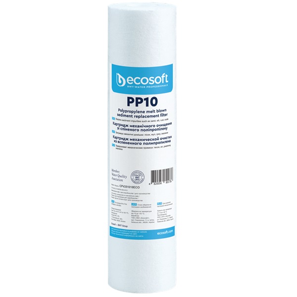 Механические загрязнения воды (ил, песок, ржавчина) в водопроводной воде могут приводить к поломкам оборудования. Для борьбы с этими загрязнениями украинской компанией Ecosoft был разработан картридж из пористого пропилена Ecosoft PP10. Размеры его пор составляют 10 мкм и с легкостью удаляют крупные частицы песка, ила, ржавчины. Чаще всего полипропиленовые картриджи используются как первая ступень очистки воды в проточных фильтрах и системах обратного осмоса. Ecosoft PP10 - изготовлен в размере 10 Slim и подходит к фильтрам большинства производителей.