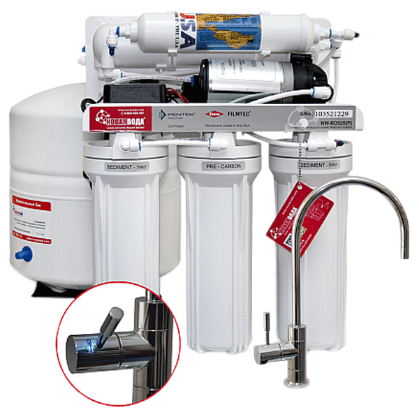 Фильтр обратного осмоса Новая Вода NW-RO525P Smart является стандартной 5-ти ступенчатой системой обратного осмоса оснащенной насосом. Главным отличием от конкурентов является специальный кран для чистой воды оснащенный LED- индикатором ресурса картриджей.