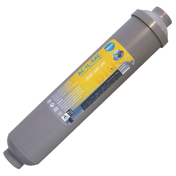 - Bluefilters IL-GAC-S – Угольный «пост фильтр». Вода, прошедшая очистку обратным осмосом не всегда приятна на вкус, поэтому для нормализации вкусовых качеств и для корректировки кислотно-щелочного баланса используется этот картридж, который полностью состоит из высококачественного активированного угля.