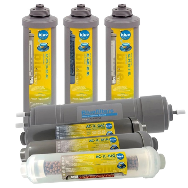 Полный набор картриджей для систем обратного осмоса Bluefilters. Набор состоит из 3-х картриджей предварительной очистки, мембраны обратного осмоса, угольного постфильтра, минерализатора и биоактиватора воды.