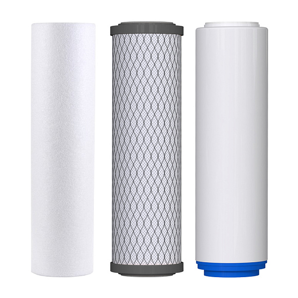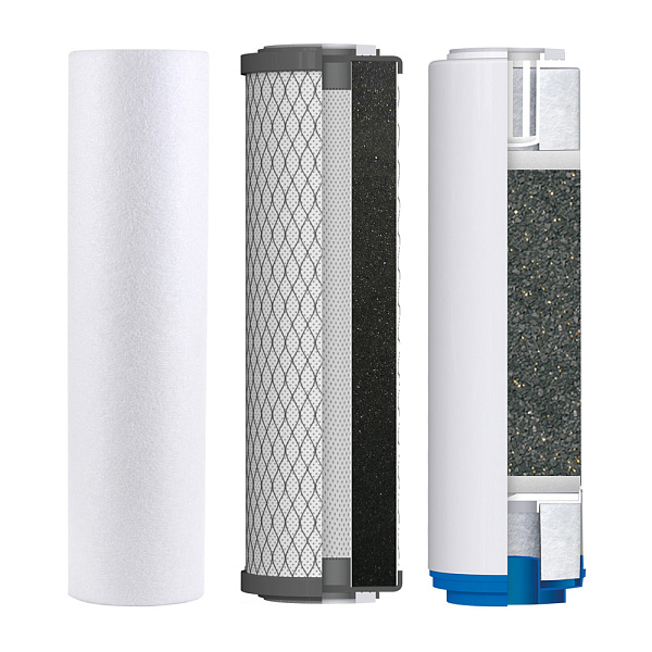 Комплект состоит из трех картриджей, каждый из которых выполняет свою функцию в процессе фильтрации: