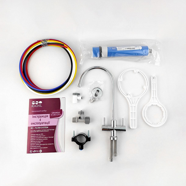 Система обратного осмоса Raifil Grando 6, как и все другие подобные фильтры работает по принципу молекулярной очистки. Вода, точнее сказать, смесь воды и загрязнений после прохождения через полупроводящую мембрану, разделяется на два потока. Первый – очищенная вода поступает в накопительную емкость, второй – вода не прошедшая очистку и загрязнения утилизируется в канализацию.