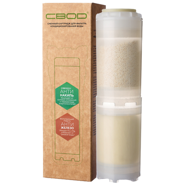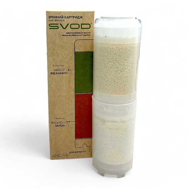 Комбинированный картридж СВОД F5ST250 - предназначен для очистки воды от избытка железа и приведения содержания железа в воде к показателям приведённых в ГОСТ (не более 0,3 мг/л)а также для умягчения воды и удаления накипи. В результате работы фильтра пропадают ржавые потёки на бытовой технике, формирование накипи на стенках водонагревающего оборудования, нормализуется вкус и запах воды (пропадает железный привкус), также бытовая техника защищается от вредного влияния железа и накипи на свою работу.