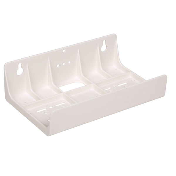 Кронштейн изготовлен из высокопрочного пластика, устойчивого к коррозии и влаге. Имеет стандартные отверстия для крепления двойных фильтров Aquafilter и других совместимых брендов. Конструкция жесткая, с усиленными ребрами, что обеспечивает надежную поддержку системы даже при регулярном обслуживании.
