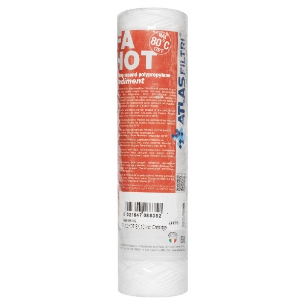 Картридж из полипропиленовой нити для удаления механических загрязнений в горячей водопроводной воде. Atlas Filtri FA HOT 10SX50 - прекрасно справляется с очисткой горячей воды от абразивных загрязнений (ил, песок, ржавчина, окалина и др.) размером более 50 мкм.