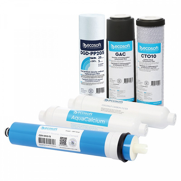 Полный набор сменных фильтрующих картриджей для системы обратного осмоса Ecosoft P'URE AquaCalcium. Набор состоит из 6 сменных элементов разработанных и изготовленных на территории Украины.