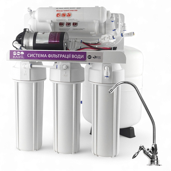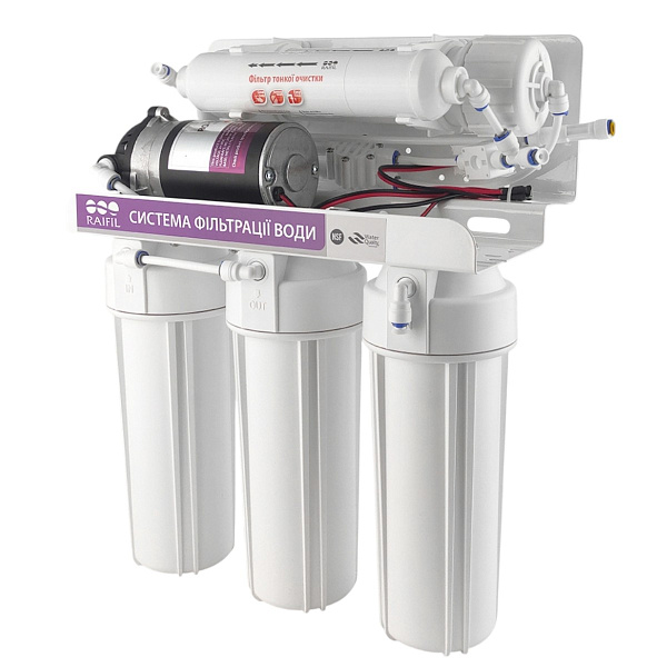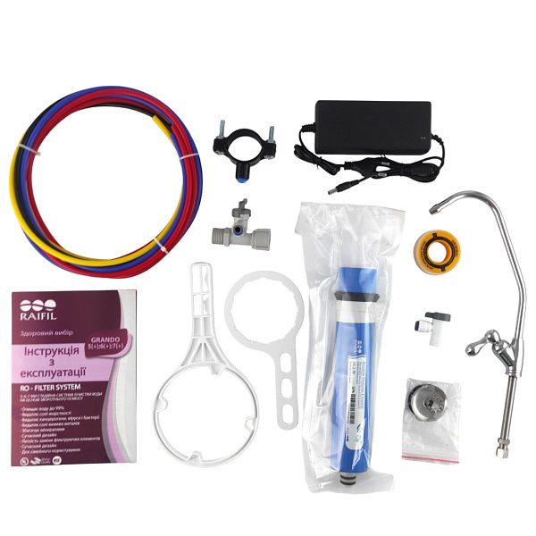 Система обратного осмоса Raifil Grando 5 Plus, как и все другие подобные фильтры работает по принципу молекулярной очистки. Вода, точнее сказать, смесь воды и загрязнений после прохождения через полупроводящую мембрану, разделяется на два потока.