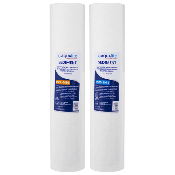 Набор картриджей Aqualite PS5M20BB и Aqualite PS20M20BB для механической очистки воды. Удаляет из воды песок, ржавчину и прочие загрязнения.