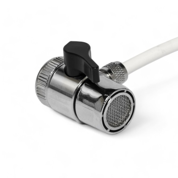 Со смесителем фильтр соединяется при помощи гибкой подводки, а в отверстие корпуса вкручивается винтовой наконечник. Другой конец наконечника устанавливается на смесителе. Нужно сначала открутить гайку и на ее место вкрутить винтовой наконечник, позволяющий регулировать правильное направление воды – или до фильтра или на мойку. Если нужно направить воду до фильтра, нужно извлечь кнопку переключателя. А чтобы остановить фильтрацию, достаточно будет вдавить кнопку до упора. В том случае, если кран имеет внутреннюю резьбу, дополнительно вкручиваем адаптер с прокладкой.