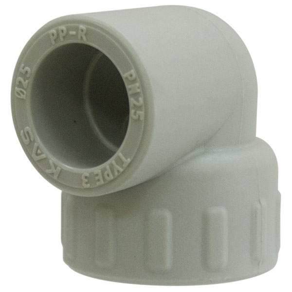 Соединительное колено с внутренней резьбой KAS изготовлено из полипропилена для пайки и имеет угол 90°. Муфта произведена в Турции.