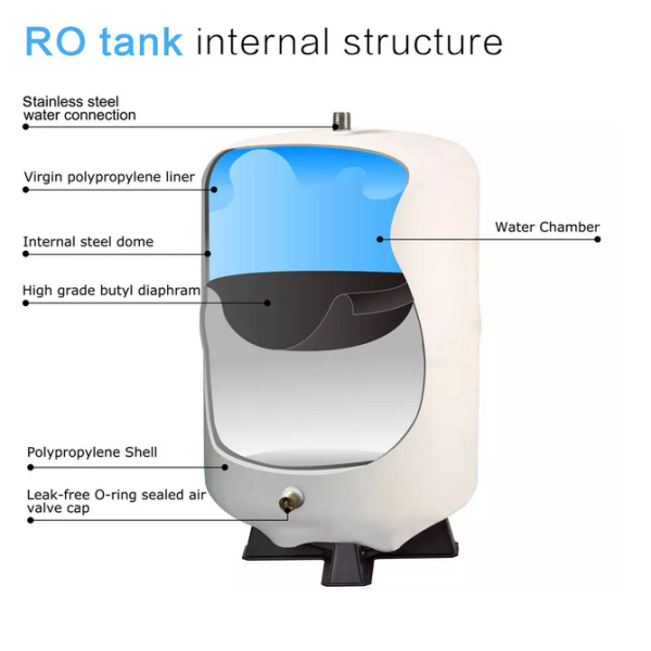 Бак изготовлен из стали с антикоррозийным покрытием и оснащён пищевой бутиловой мембраной, что гарантирует чистоту и безопасность воды. Модель имеет резьбовое подключение 1/4" и совместима со всеми современными системами обратного осмоса. Внутренний объём бака составляет 18 л, а полезный объём, доступный для воды, - примерно 12 л.