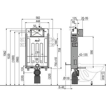 Скрытая система инсталляции для замуровывания в стену AlcaPlast AM115/1000E Renovmodul серии Ecology для установки подвесного унитаза с интервалом крепления 180 мм или 230 мм, управление смывом сверху или спереди.