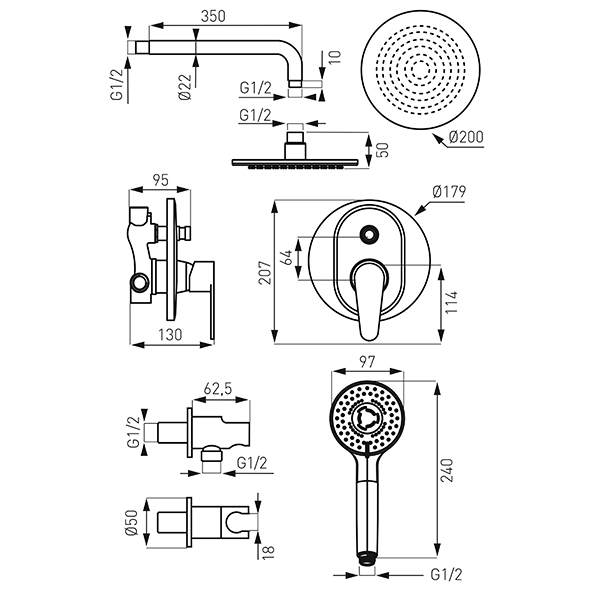 Набор (скрытый смеситель для душа, душевая лейка с шлангом, верхний душ)