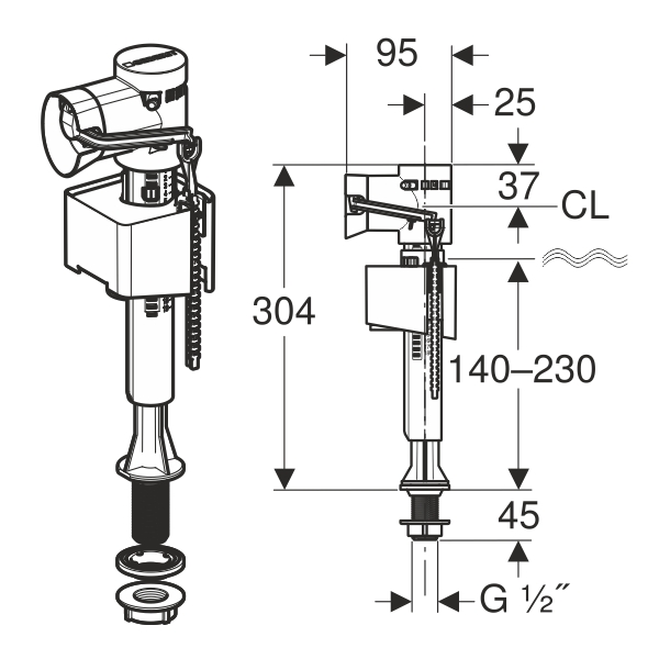 Описание Впускной клапан Geberit Geberit Impuls Basic 340, подвод воды снизу, 1/2'', ниппель из пластика (136.726.00.1)
