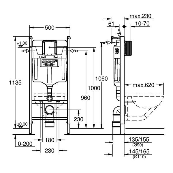 Комплект для установки подвесных унитазов любых производителей с межосевым расстоянием под крепежные шпильки 18 см или 23 см - Grohe Solido укомплектован всем необходимым для монтажа. Монтаж может осуществляться как перед капитальной стеной, так и пустотелой перегородкой. В комплект Grohe Solido входит застенный модуль, комплект для крепления. Застенный модуль может выдерживать вес до 400 кг, оборудован баком емкостью 9 л, который изготовлен из ударопрочного и стойкого к низким температурам материала.