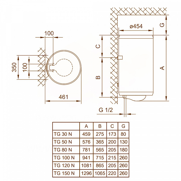 Тип установки: настенный. Тип размещения: вертикальный. Мощность: 2000Вт. Объем бака: 100л. Тип управления: механический. Мокрый ТЭН. Высота - 926 мм. Ширина - 454 мм. Глубина - 461 мм. Артикул: 515298 / 700144