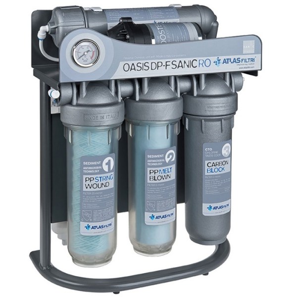 Новейшая разработка компании Atlas Filtri антибактериальный фильтр обратного осмоса Oasis DP Sanic Pump - состоит из четырёх стадий очистки воды, постфильтра и минерализатора. Система изготовлена из высококачественных материалов, что обеспечивает длительную и беспрерывную работу фильтра, а также гарантирует подачу качественной воды в вашей семье. Используемые картриджи обладают антибактериальными свойствами, производятся в Эвросоюзе и отвечают самым строгим стандартам качества.
