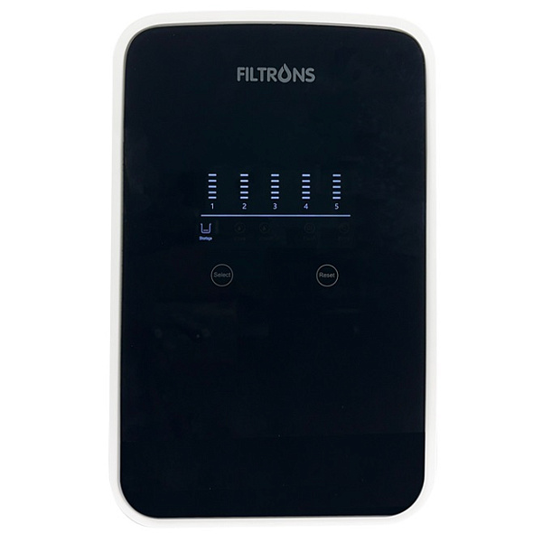 Система обратного осмоса FILTRONS 400 оснащена информационным экраном, отображающим ресурс сменных картриджей и текущее состояние фильтра. Также с помощью сенсорных кнопок Select и Reset можно управлять функциями системы.