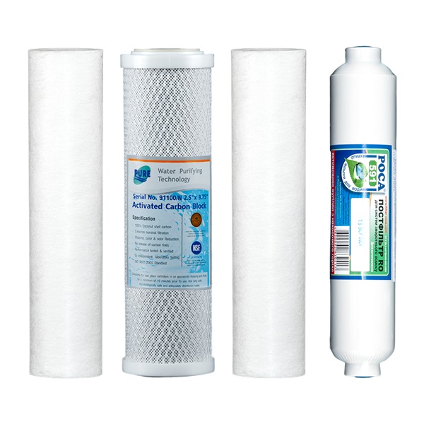 Комплект включает три предфильтра и постфильтр. Сочетание двух ступеней механической очистки и высококачественного кокосового угля позволяет эффективно удалять механические примеси, хлор, органические вещества и неприятные запахи, а также продлевает срок службы мембраны обратного осмоса.