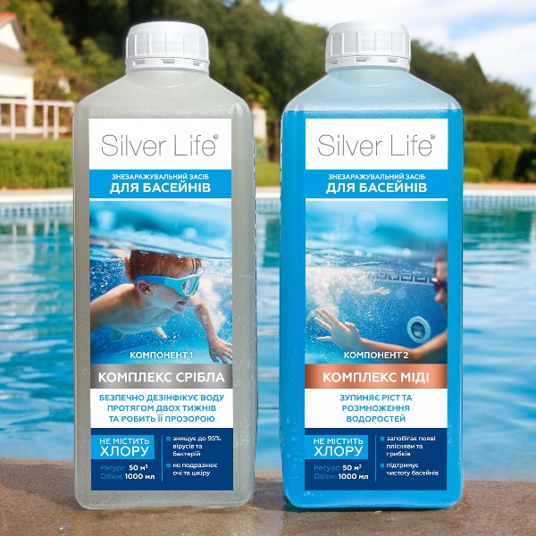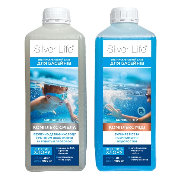 Серебряный бактерицидный комплекс для бассейнов SVOD Silver Life (2*1000 мл) обеспечивает эффективное обеззараживание воды, подходит для любых бассейнов и фонтанов. Универсальное двухкомпонентное средство состоит из: