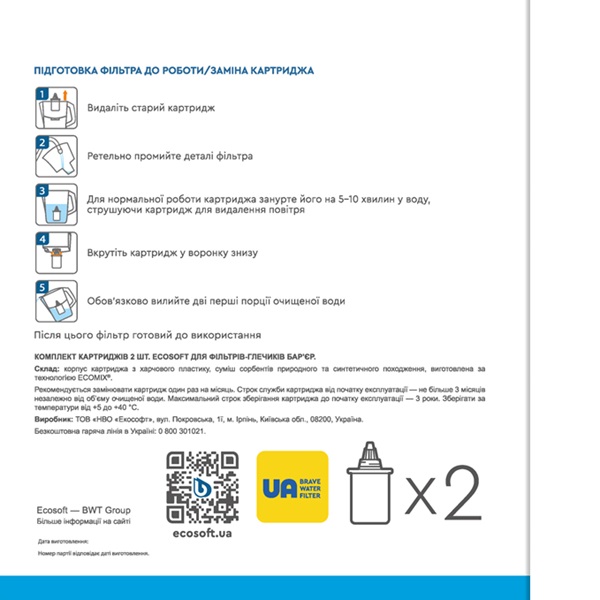 Картриджи ECOSOFT применяются в кувшинных фильтрах для бытовой очистки водопроводной воды. Эффективно устраняют неприятные запахи, вкус, хлор, органические загрязнения и уменьшают жёсткость воды. Подходят для ежедневного использования в домашних условиях.