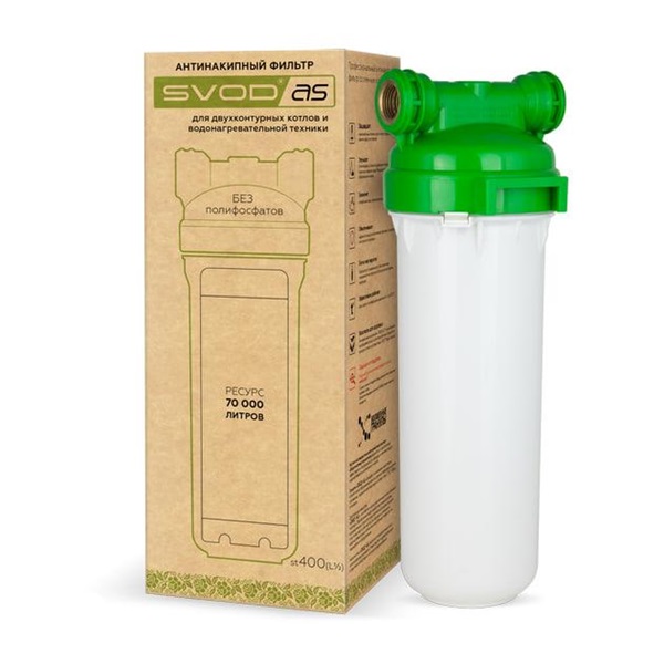 Фильтр СВОД-АС ST400 благодаря своему наполнителю - предотвращает образование накипи, отложение солей на внутренних поверхностях резервуаров водонагревающего оборудования и запорной арматуры. Эффективно защищает бытовую техники от преждевременного износа, способствует экономии электроэнергии при нагреве воды бытовыми приборами. В новом поколении фильтров используется колбы с латунным подключением, что значительно упрощает процесс подключения и монтирования фильтра к водопроводной системе.