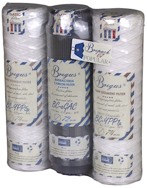 Набор сменных картриджей предназначен для трёхступенчатой предварительной очистки воды в системах обратного осмоса и проточных фильтрах. Особенность — увеличенный диаметр фильтрующих элементов до 68–70 мм, что обеспечивает больший ресурс и эффективность.