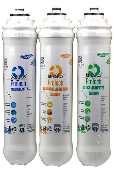 Набор сменных картриджей для систем обратного осмоса Bregus® ProTech 01 (артикул BPT‑CART‑1) состоит из 3 элементов, обеспечивающих поэтапную фильтрацию воды: