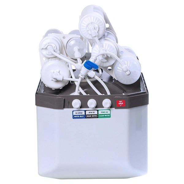 Очистка происходит в 6 этапов. Сначала вода проходит механическую и угольную предварительную фильтрацию для удаления песка, ржавчины, хлора и органических соединений. Далее вода под давлением, которое обеспечивает встроенная помпа, подается на мембрану обратного осмоса.