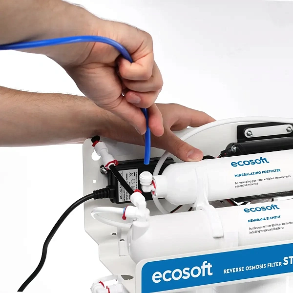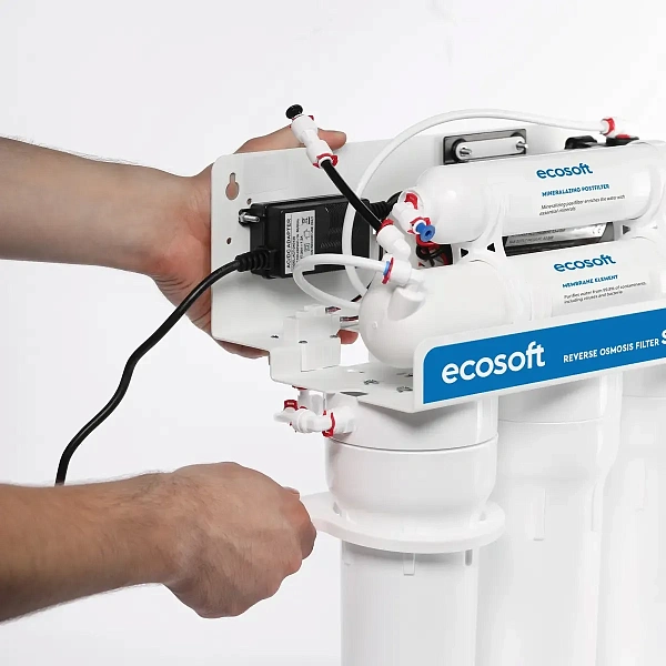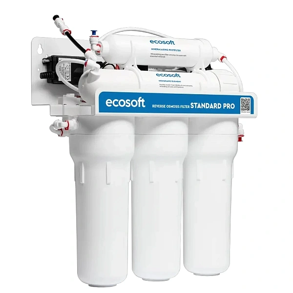 Ecosoft Standard PRO MO550MPECOSTD - это 5-ступенчатая система обратного осмоса с минерализатором и встроенной помпой повышения давления. Модель разработана для глубокой очистки водопроводной воды в квартирах и частных домах, особенно при низком или нестабильном давлении.