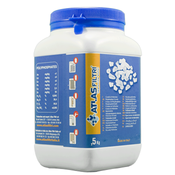 Поліфосфатні кристали Atlas Filtri 10/20 - це високоякісне дозувальне завантаження, яке застосовується у спеціальних фільтрах-дозаторах для захисту обладнання від утворення накипу. Поліфосфат запобігає кристалізації солей жорсткості, тим самим зменшує утворення відкладень у бойлерах, котлах, пральних і посудомийних машинах, трубопроводах та нагрівальних елементах.