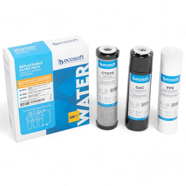Комплект Ecosoft CHV3ECO 1-2-3 призначений для попереднього очищення води у системах зворотного осмосу. Три картриджі послідовно видаляють механічні домішки, хлор, органічні речовини, важкі метали та покращують органолептичні властивості води.