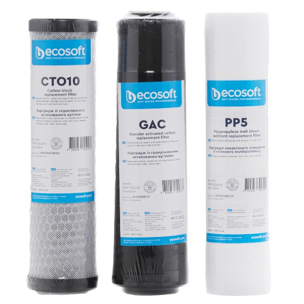 Ecosoft CTO10 – вугільний картридж у формі пресованого блоку. Видаляє органіку, залишковий хлор, покращує запах і смак води, а також додатково фільтрує механічні домішки.