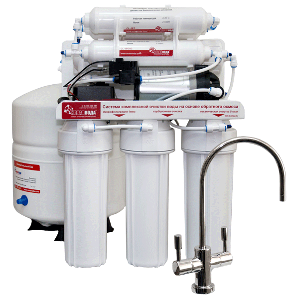 Система зворотного осмосу Новая Вода NW-RO702Р до стандартних 5-ти щаблях очищення додатково оснащується насосом, мінералізатором і біоактиватором. З огляду на, що метод очищення зворотним осмосом видаляє з води 99,8% всіх розчинених речовин - з води крім шкідливих речовин (бруду, бактерій, вірусів), видаляються і мінерали. Переважна більшість мінералів та інших корисних речовин ми отримуємо з їжі, вода насичена мінералами приємніше на смак. Саме для цього і додають картридж мінералізатор.