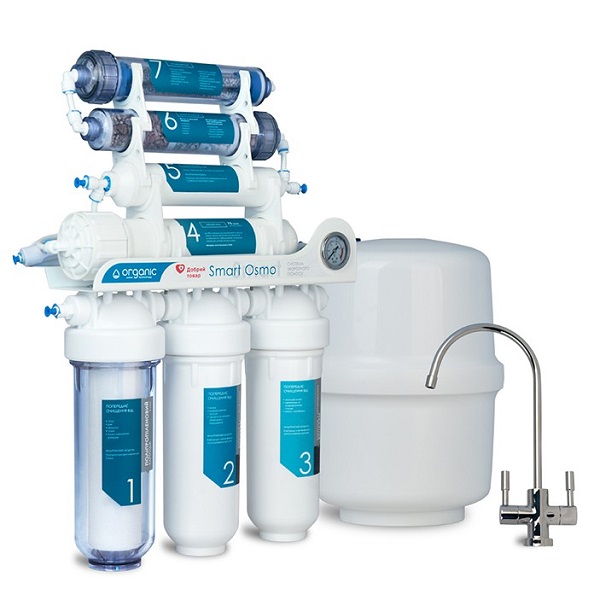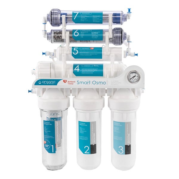 Organic Smart Osmo 7 - високотехнологічна система зворотного осмосу, створена з кращих комплектуючих і матеріалів, що фільтрують. Технологія зворотного осмосу дозволяє отримати чисту, смачну і безпечну питну воду прямо у вас вдома. Система призначена для очищення води від всіх домішок, включаючи віруси і бактерії - таку воду можна пити без кип'ятіння і використовувати для дитячого харчування. Після очищення вода насичується корисними мінералами і проходить через картридж-біоактиватор. Систему Organic Smart Osmo 7 при необхідності легко модернізувати - додати ультрафіолетову лампу для 100% захисту очищеної води.