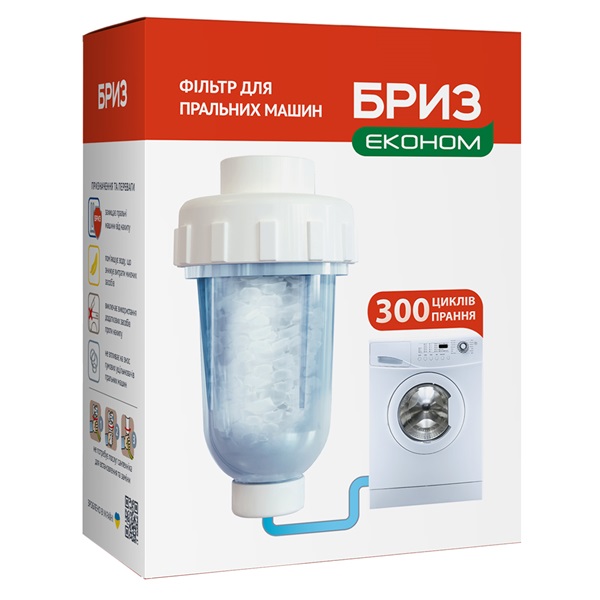 Фільтр Бриз Економ використовується виключно для технічних цілей. Його встановлюють на трубопроводі подачі холодної води до пральної машини для запобігання утворенню накипу.