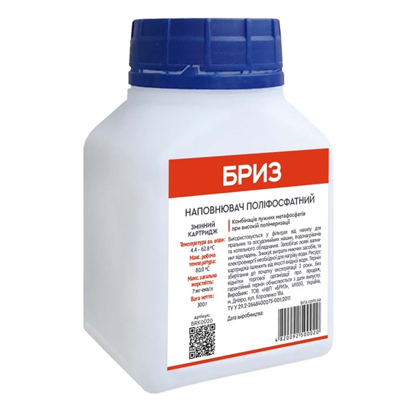 Наповнювач поліфосфатний Бриз використовується для підготовки води перед використанням у пральних машинах, призначених для побутового використання. Він запобігає утворенню накипу на нагрівальних елементах і внутрішніх поверхнях пральних машин.