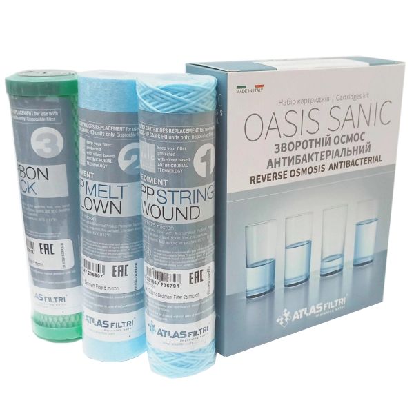 Набір антибактеріальних картриджів Sanic для систем зворотного осмосу і проточних фільтрів виробництва фірми Atlas Filtri. У набір входять 3 картриджа для очистки води від різних забруднень. Всі картриджі виробляються в Італії, відповідають строгим санітарним нормам і сертифікований NSF. Картриджі повністю сумісні з будь-якими фільтрами розміру 10".
