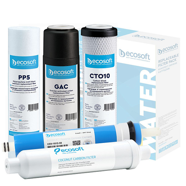 Набір Ecosoft RO5 - це повний комплект змінних елементів для обслуговування побутових систем зворотного осмосу. До складу входять три картриджі попереднього очищення, мембранний елемент та вугільний постфільтр. Комплект забезпечує багаторівневе очищення води - від грубих механічних домішок до найдрібніших хімічних сполук.