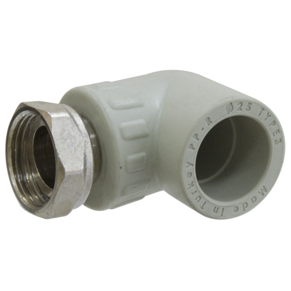 З'єднувальне коліно з никадною гайкою, кут 90°. З'єднання - труба DN25, різьблення 3/4" ВР. Матеріал - поліпропілен. Виробник - Туреччина. (Арт. 9630004)
