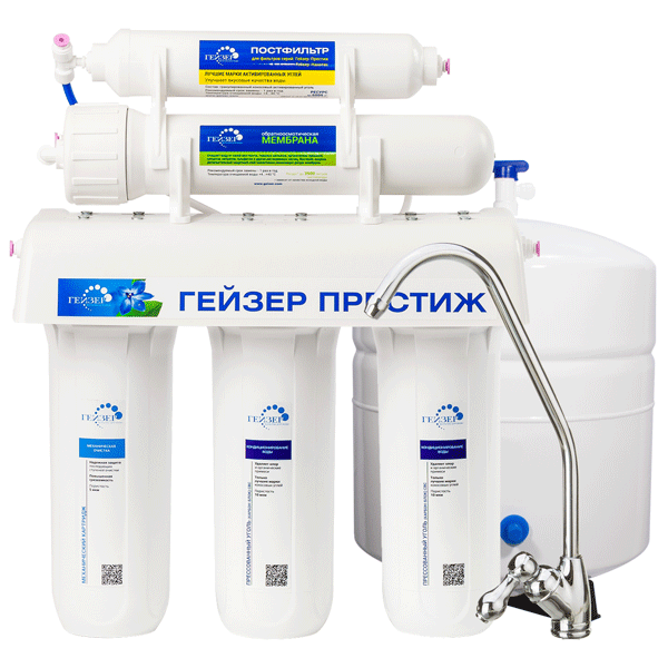 Система зворотного осмосу Гейзер Престиж - п'ятиступінчаста система очищення води. Завдяки очищенню за принципом зворотного осмосу з води видаляється до 99,9% забруднень, а попереднє очищення від механічних і органічних забруднень - значно продовжує термін служби мембрани зворотного осмосу.