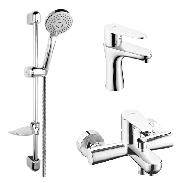 Набір (змішувач для ванної, душова штнга з лійкою і шлангом, змішувач для умивальника) FERRO ALGEO