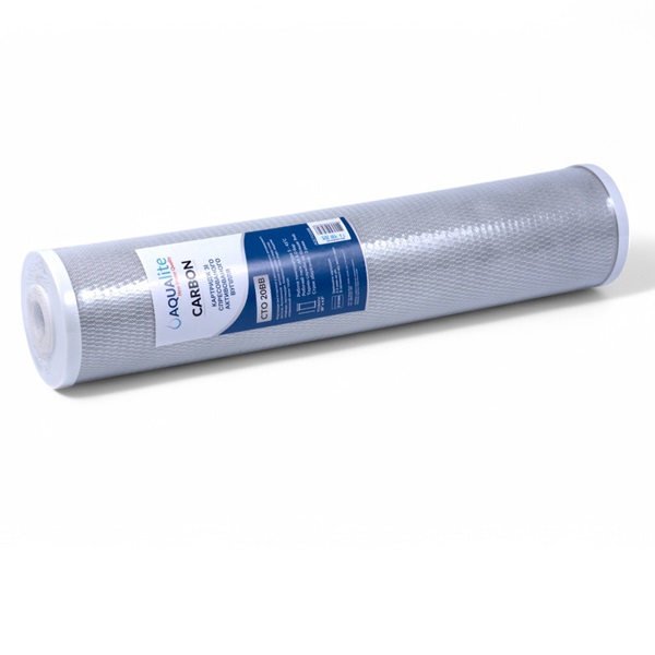 Вугільний картридж Aqualite CTO 20BB виготовлений з активованого вугілля в формі спресованого блоку українською компанією Aqualite. Картридж призначений для видалення з великої кількості води, що очищається хлору, органічних забруднень, а також механічних частинок розміром 10 мкм. Aqualite CTO 20BB знижує концентрацію пестицидів, нафтопродуктів, фенолу, кольорових і важких металів у воді. Картридж сумісний з більшістю магістральних фільтрів виготовлених в розмірі 20 Big Blue.