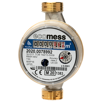 Одноструйний лічильник з сухим квдрантом і прямим зчитуванням з 8 цифрових роликів. Циферблат лічильника обертається на 3600, що дає можливість розмістити його як вертикально так і горизонтально. Виключені ризики корозії і утворення осаду. Гарантія довговічності і високої точності. Сертифікований за стандартами ЄС.