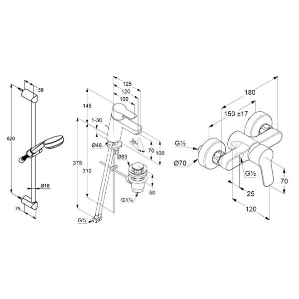 Набір (змішувач для душа, душова штанга з лійкою і шлангом, змішувач для умивальника)
