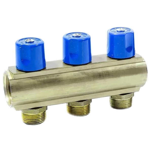 Розподільчий колектор з трьома вентилями, з виходами НР підходить для мідних фітингів, PEX, полібутиленові або металопластикових трубопроводів.