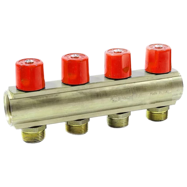 Розподільчий колектор з чотирма вентилями, з виходами НР підходить для мідних фітингів, PEX, полібутиленові або металопластикових трубопроводів.