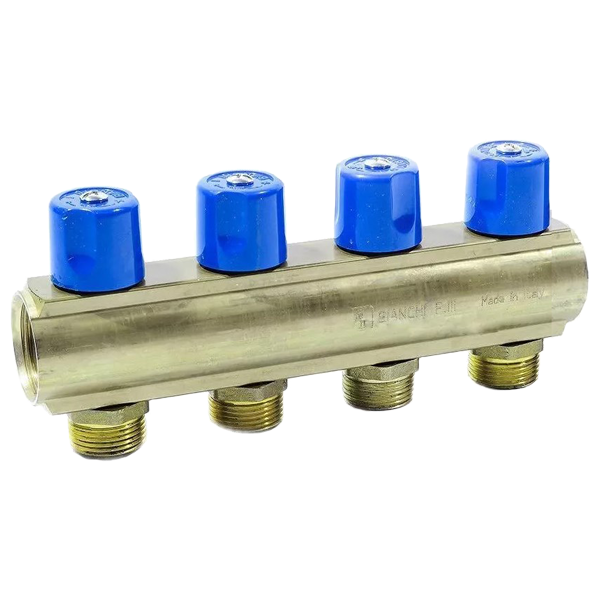 Розподільчий колектор з чотирма вентилями, з виходами НР підходить для мідних фітингів, PEX, полібутиленові або металопластикових трубопроводів.