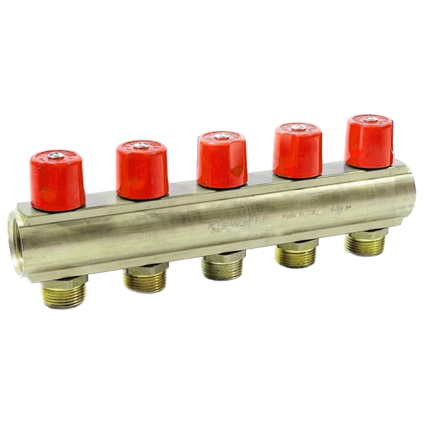 Розподільчий колектор з п'ятьма вентилями, з виходами НР підходить для мідних фітингів, PEX, полібутиленові або металопластикових трубопроводів.
